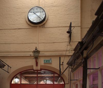 Looking across to the High Street entrance on the other side of the market, you will see the bell which used to be rung to mark the end of trading hours, and a splendid clock donated by Gray’s, a well-known local firm of electricians [see photo].